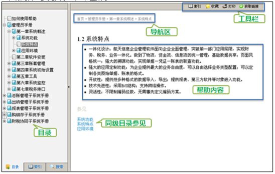 帮助由以下部分组成:工具栏、目录、索引、搜索、帮助内容、参见目录。如下图所示: