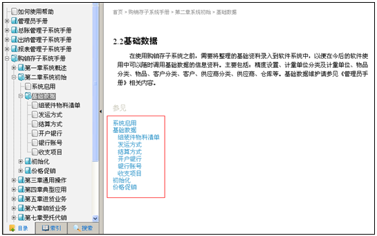 - 用户单击链接主题,则帮助跳到所链接的主题,可查看该主题及其包含的子目录相关内容。返回时可通过浏览器上的〖后退〗按钮进行返回;若跳了若干个主题,则按若干次〖后退〗。
