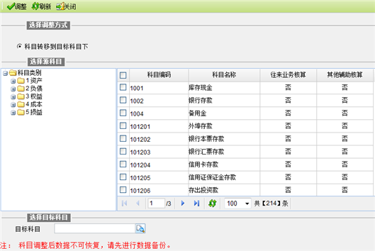 【第一步】点击“工具/数据/科目调整”菜单项,进入科目调整页面。如下图所示: