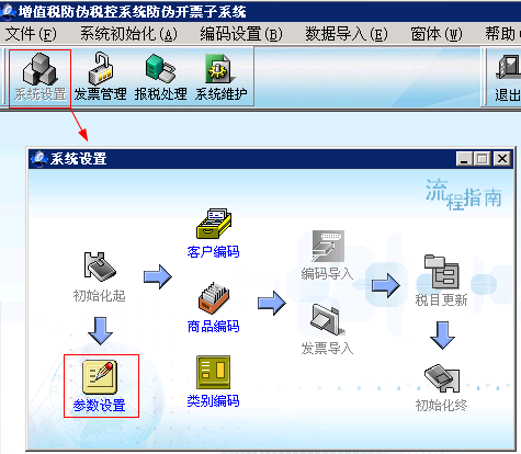 【第三步】在防伪开票主界面,系统设置中点击〖参数设置〗按钮,进入系统参数设置页面。选择A6凭证接口,并选择启用。如下图所示: