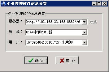 【第五步】在科目设置页面,点击〖参数〗按钮,进行服务器、账套与用户设置。服务器录入完成后,须点击〖更换〗按钮,更新服务器账套数据,再选择账套与用户。如下图所示: