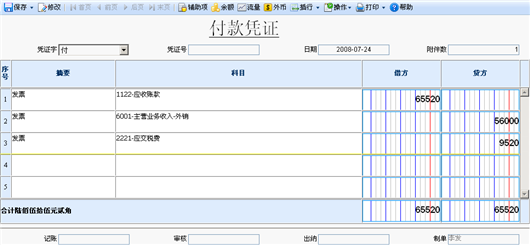 【第九步】点击〖制单〗按钮,将所选发票生成凭证。如下图所示:在防伪开票生成的凭证可以在“发票转凭证/发票转凭证查询”菜单项进行查看。