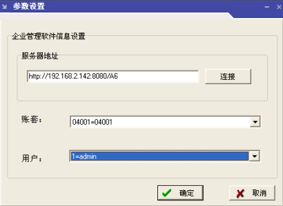 【第三步】在网上认证页面,点击“发票转凭证/参数设置”菜单项,在参数设置页面,输入A3企业管理软件的服务器地址,并通过“连接”功能进行测试,连接成功后,选择账套以及登录账套的用户。设置完成点击〖确定〗。如下图所示: