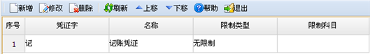 修改时,选中要修改的凭证字,点击〖修改〗按钮,可修改凭证字的“凭证字、名称、限制类型、限制科目”项目,修改完成后点击〖保存〗按钮进行保存。凭证字状态默认为“有效”,基础版不可修改。