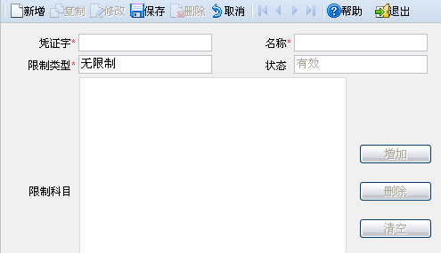 限制科目由用户参照输入,数量不限,可以是任意级次的科目,若限制科目为非末级科目,则在制单时,其所有下级科目都将受到同样的限制。限制科目选择后可以通过〖清空〗、〖删除〗按钮对限制科目执行相应操作。