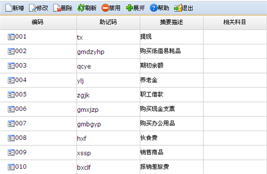 2. 常用摘要中的“修改”只能修改“编码、助记码、摘要描述、相关科目”,使用状态只能通过常用摘要页面中的“禁用”按钮进行修改。相关科目录入后,凭证录入常用摘要后,可以自动带入涉及的相关科目