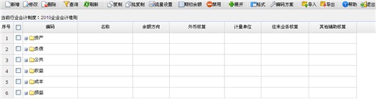 用户可以根据业务的需要进行增加、修改、删除、复制、查询、导入、导出会计科目,并设置编码方案。在此也可以直接进行现金流量科目设置。如下图所示