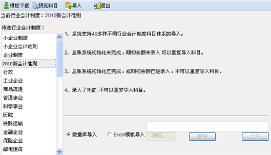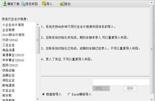 - 数据库导入:选择左则行业会计制度,点导入即可。选择左则行业会计制度,点〖预览科目〗可预览所选行业的科目。