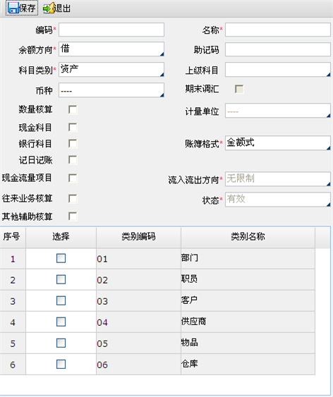 - 数量核算:勾选此项则科目带数量核算,若勾选此项则必须选择计量单位。