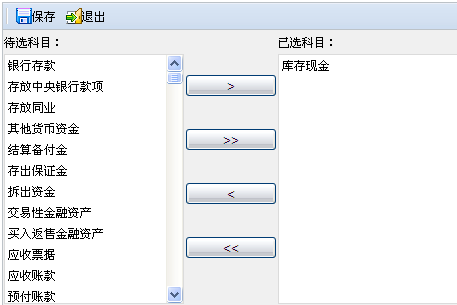 若科目已勾选[现金流量项目],则此页面会自动显示该科目为已选科目。选择现金流量科目(一般为现金类和银行类科目,或者现金等价物科目),保存即可。如图:已选科目[库存现金],在录入凭证时,如果凭证中包含[库存现金]科目,则该凭证可录入现金流量。