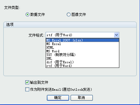 1) 数据文件支持:MS Excel 2007(XLSX)、MS Excel、HTML、MS Word、TXT(制表符分隔)、XML、dif(用于Excel)、rif(用于word)。