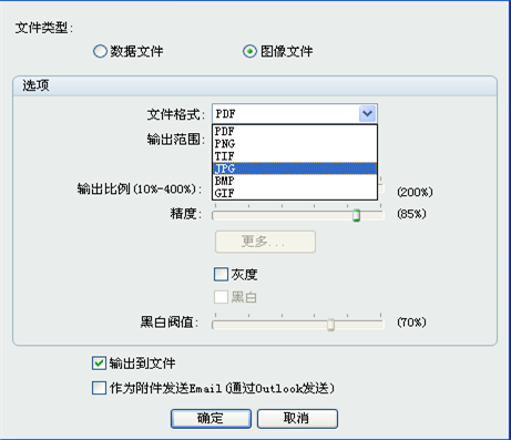 2) 图像文件支持:PDF、PNG、TIF、BMP、GIF,同时可设置精度和黑白阀值。