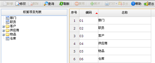 基础版系统提供客户、部门、职员、供应商、物品、仓库、六个固定的辅助核算。如下图所示