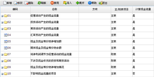 - 对已使用的现金流量项目不可删除,但可通过“禁用”功能修改使用状态。