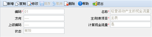 为了方便用户能够简单快捷的编制现金流量表及其附表,本系统在软件中预置了“企业现金流量项目”。用户可以根据单位实际需要对预置的主/附表项目进行修改、删除。