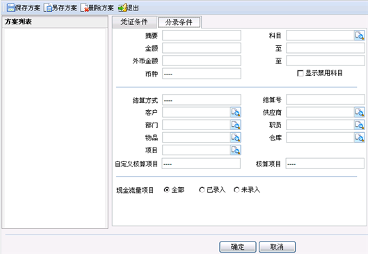 分录条件:指按凭证摘要、科目、金额、结算方式,结算号,币种,供应商,部门,职员,物品,仓库等分录信息进行查询。