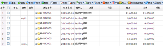 【第三步】选择凭证后,点击相应的操作按钮,完成相关操作。下面详细介绍全部审核、全部记账、禁用/启用、冲销和导入操作。