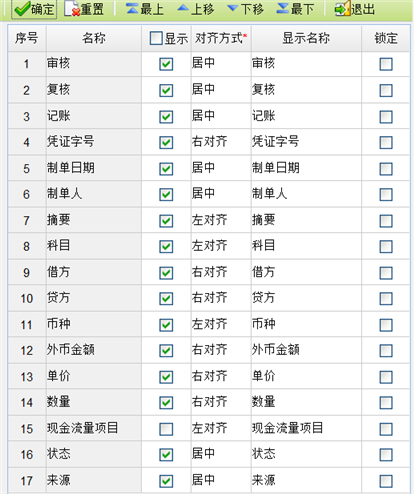 功能:用户使用此功能可以自由设置凭证查询页面表体列名的显示。