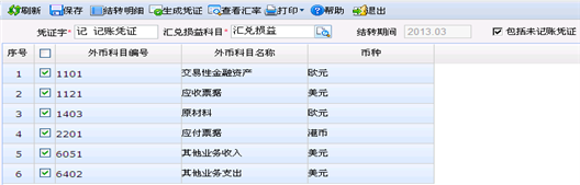 【第一步】点击【功能导航/总账管理/转账/期末调汇】菜单项,进入期末调汇页面,系统自动显示要计算汇兑损益的科目。如下图所示
