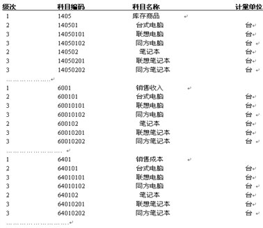 【第二步】在库存、收入、成本科目处录入会计科目,要求库存、收入科目必须带数量核算,成本可带可不带。三科目可以为外币科目,库存科目和收入科目级次必须相同,成本科目级次是其级次的子集,且这三个科目的下级必须一一对应,设置如下: