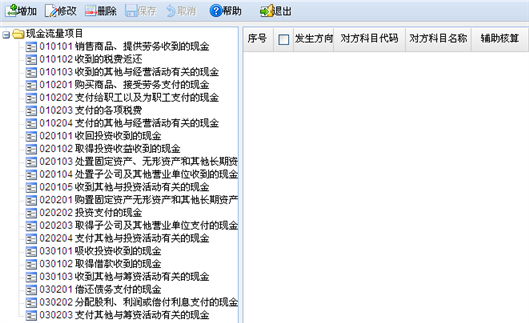 - 发生方向:现金流入项目,对方科目的科目方向系统默认显示贷方;现金流出项目,对方科目的科目方向系统默认显示借方。