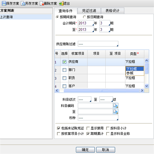 - 核算项目:选择所需查询的具体供应商代码或范围。