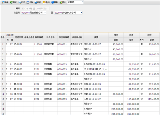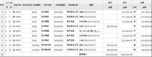 - 跨期累计:在查询出符合条件的记录后,仅有一个合计项;按照年,月,日,凭证字,科目,供应商所属地区(供应商类别,业务员,部门),项目排序;