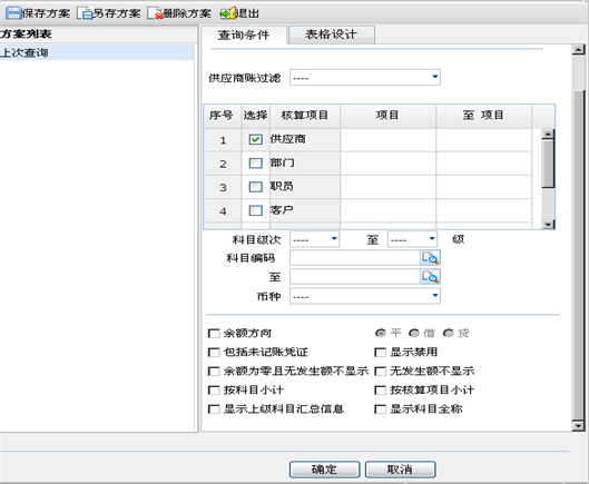 - 核算项目:选择所需查询的具体供应商代码或范围。