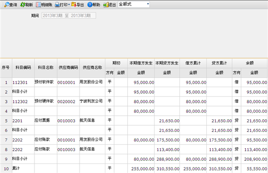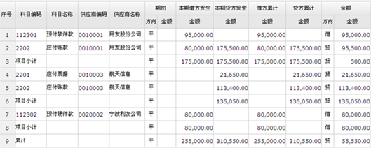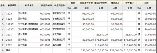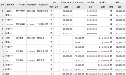 【第二步】输入查询条件后,点击〖确定〗按钮进入供应商余额表查询页面,若查询条件勾选了“按科目小计”则查询结果按科目排序并显示科目小计行,如下图: