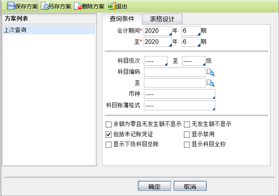 【第一步】点击【功能导航/财务/总账管理/账表/总账】,屏幕显示总账查询条件设置页面,如下图所示也可将查询条件保存到“方案列表”中,以方便日后同条件查询。