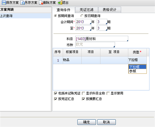 - 类型:设置查询结果页面核算项目选择方式的类型,可选项有:下拉、参照。