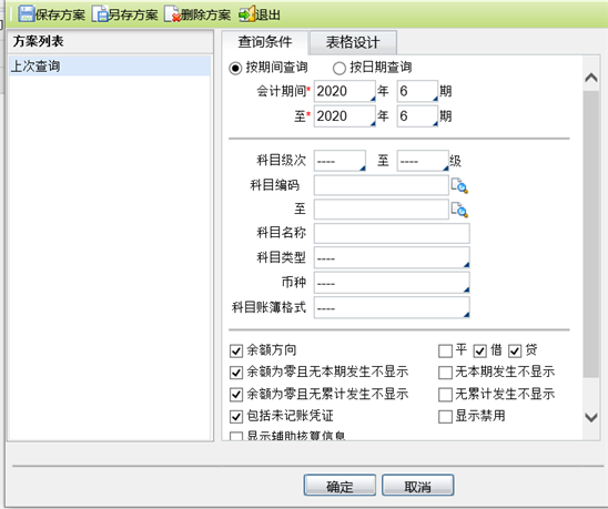 - 无本期发生不显示:选择此项,则查询结果无论余额是否为零,只要无本期发生的科目都不显示。