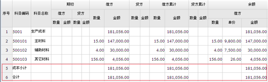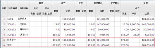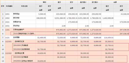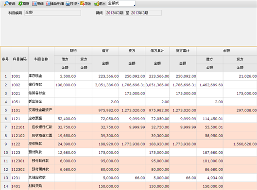 【第二步】输入查询条件后,点击〖确定〗按钮进入科目余额表查询页面,如下图所示带辅助核算科目行用深颜色表示。