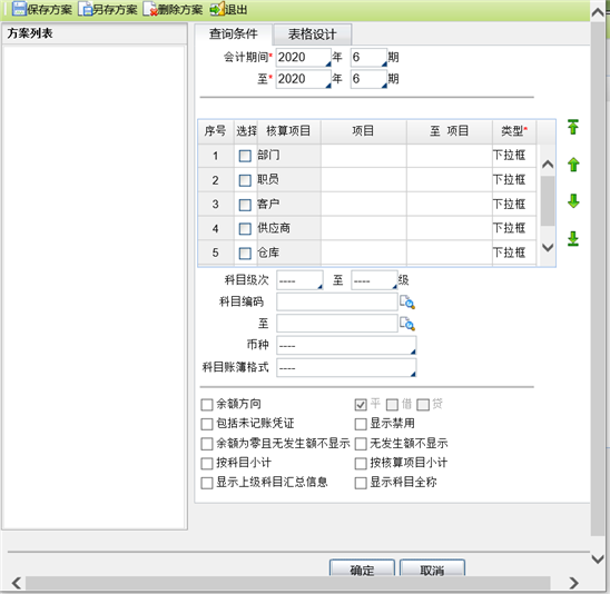 - 核算项目:选择所需查询的辅助核算,并可录入具体辅助项范围进行查询。可同时勾选多个辅助核算,多个辅助核算之间是并的关系。如:同时勾选“部门”和“职员”,则显示带部门和职员核算的科目,不显示只带部门或只带职员的科目。