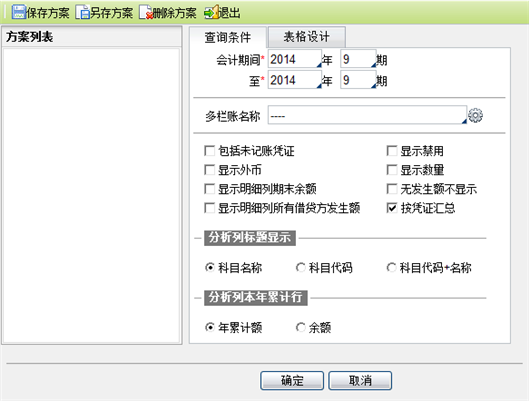 - 明细列显示所有借贷发生额:勾选此项,则无论该科目多栏账是按借方分析还是按贷方分析,明细科目列均显示所有发生额。不勾选此项,则明细科目列只显示分析方向发生额。若科目多栏账设置按余额分析,则此选项不可选。