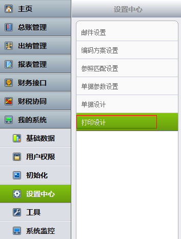 【第一步】点击【功能导航/我的系统/设置中心/打印设计】套打文件设置入口如下图: