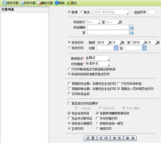 - 所选科目按所选账页格式打印:所选的明细账全部按照指定的账表格式打印。
