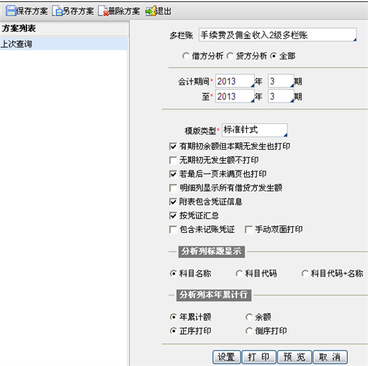 - 借方分析、贷方分析、全部:用于设置按借方或贷方分析并打印账簿。