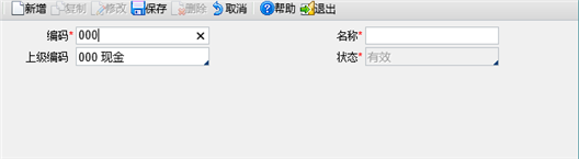 - 输入结算方式“编码、名称”等信息,对于有上级编码的选择其上级编码。点击〖保存〗按钮对新增的结算方式进行保存,保存成功后系统继续停留在新增页面,若不再新增,点击〖退出〗按钮即可退出编辑页面。
