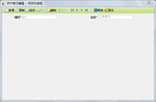 - 输入开户银行的编码、名称信息。点击〖保存〗按钮,将新增的开户银行进行保存。在开户银行页面,选中记录,点击〖修改〗按钮可实现修改银行信息。 点击〖删除〗按钮,可将开户银行删除。