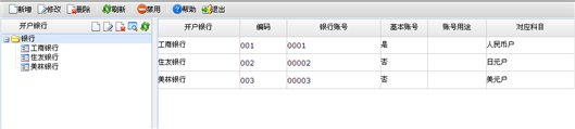 【主要功能】对企业的银行账号进行新增、修改、删除等功能。此外,可在该菜单下维护开户银行信息。如下图所示:
