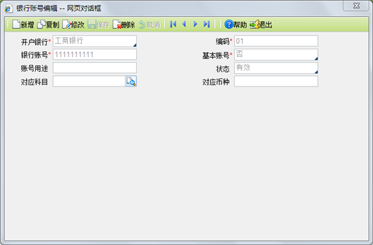 按钮,可新增开户银行。编辑数据完成后,点击〖保存〗按钮,即完成开户银行新增功能。如下图所示: