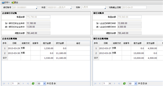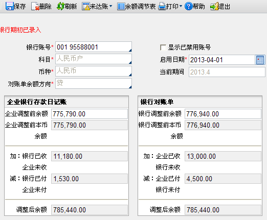 【主要功能】录入企业银行日记账期初及期初未达账项,并可查看银行余额调节明细信息。