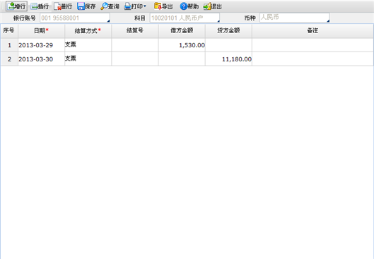 - 在银行期初页面点击〖未达账—期初企业未达账〗按钮,进入期初企业未达账项录入页面,录入相关未达账项信息。在此页面可通过〖增行〗按钮,增加一条新的未达账,通过〖删行〗按钮,将不需要的未达账项删除。