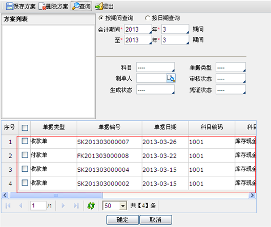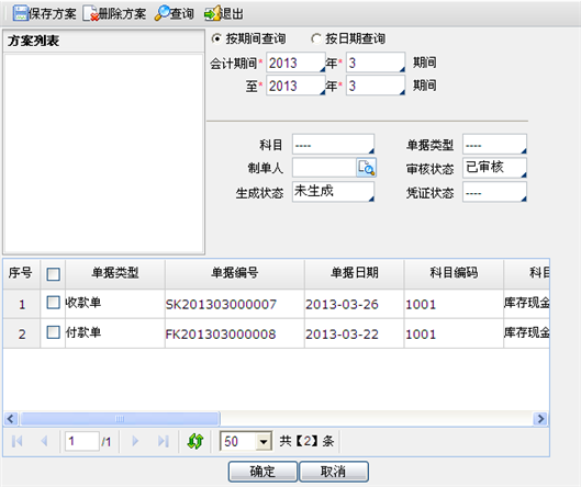 - 生成状态:选择单据是否已经生成日记账的情况。系统提供“已生成”“未生成”、“全部”选项。已生成的单据只可查看,不能重复生成。