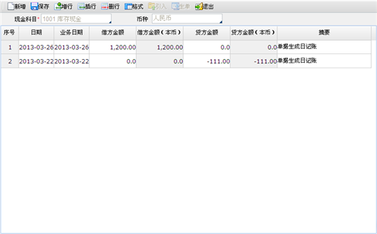 - 系统进入“现金日记账新增多行”页面,在此页面可在查看日记账明细。如下图所示: