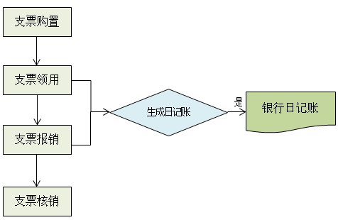 支票管理主要是对支票的购置、领用与报销的情况进行管理,通过支票管理及时了解支票领用、报销情况。业务流程如下图所示: