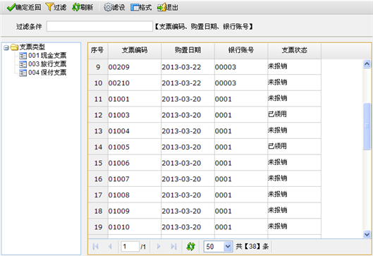 - 可在过滤条件中输入支票编码或购置日期、银行账号等信息,点击〖过滤〗按钮,方便快速定位支票。选择要领用的支票号码,点击〖确定返回〗按钮,系统返回到支票领用页面,如下图所示: