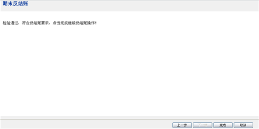 - 点击〖完成〗按钮,系统弹出反结成功提示,点击 〖确定〗按钮,完成期末反结账。