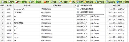 - 从服务器文件创建:将以前备份的数据库文件中直接进行恢复。仅限本机备份本机恢复。在恢复前系统自动提示创建新账套。